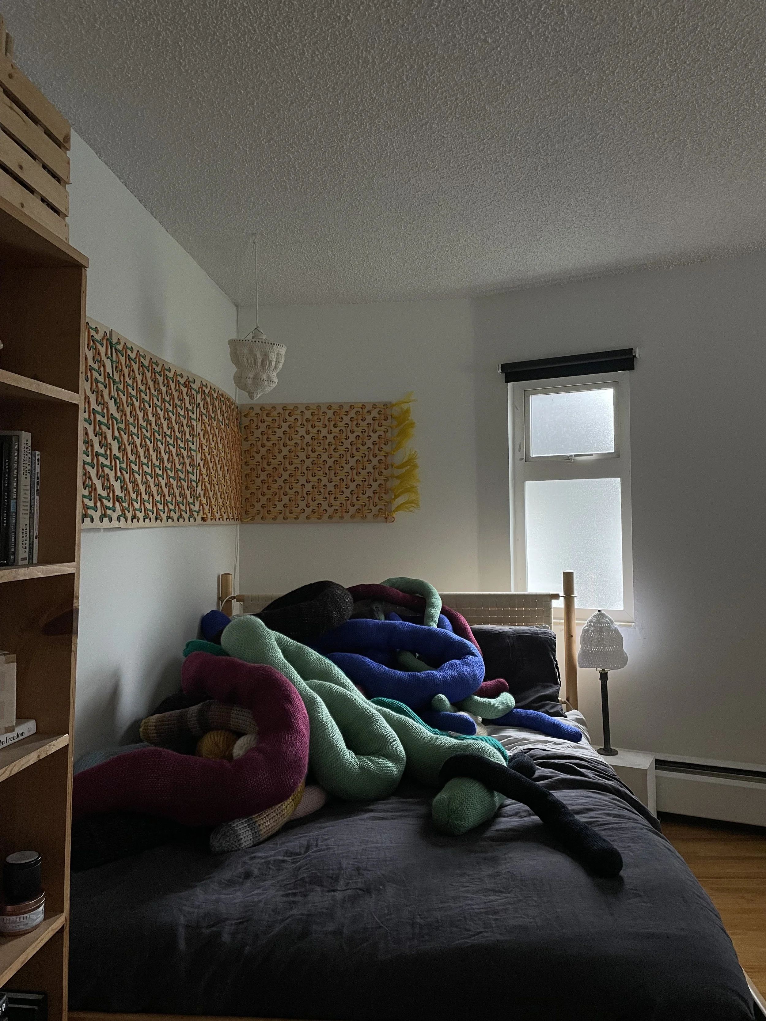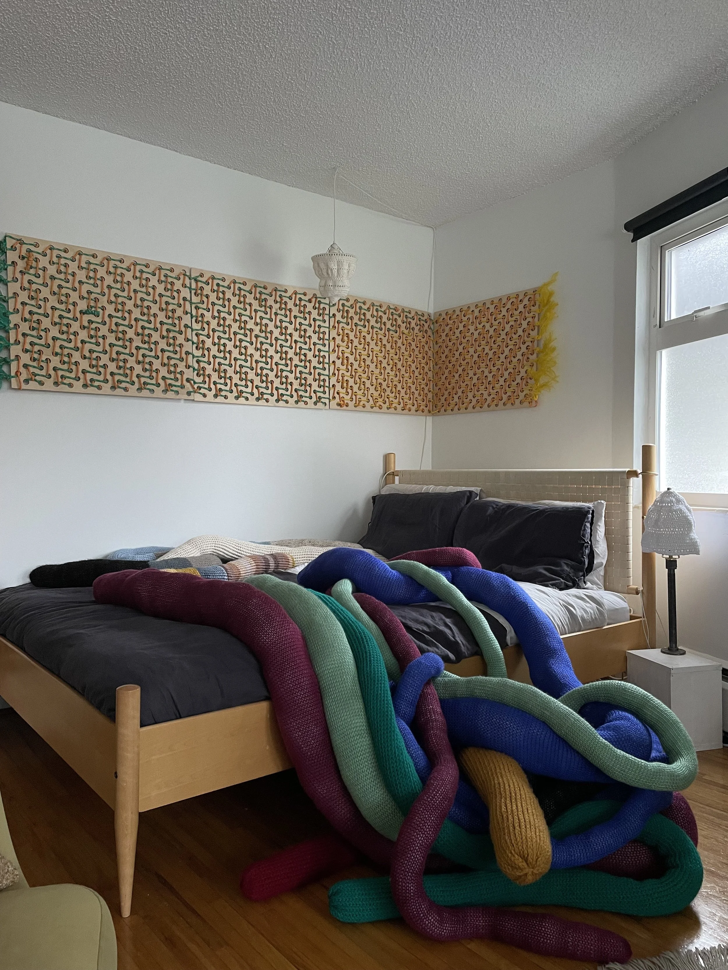 In this series of The Worms they are to be viewed as extensions of myself, exaggerated limbs and breaths. Each video is both a mediation and a dance. A conversation from one body to another, on needs and desires. As I move around the bed the position of the worms enabled or inhibited movement. This process was both chunky and smooth, awkward but seamless. Throughout the videos the worms begin to breathe with me as I lay beneath them. In other shots they take over, claiming my breath as their own while burying my body. The time laps allows for a more immediate (snapshot) understanding, while the longer video is far more intimate and personal. These videos invite you into a vulnerable moment, space and conversation. In this project I am using the worms and my body as navigational tools in order to challenge the borders of comfort and capture.